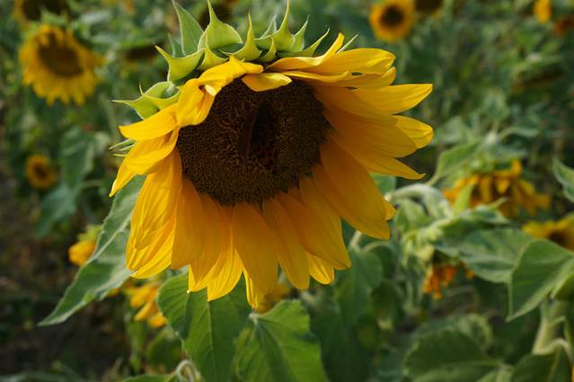向日葵又叫望日莲,是随太阳开放的花,灿烂的脸庞总是朝向南方。向日葵的花语是信念、光辉、高傲、忠诚、爱慕,向日葵的寓意是沉默的爱,向日葵代表着勇敢地去追求自己想要的幸福。