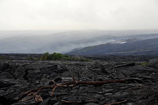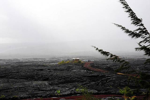 飞机刚刚离开Hilo机场,只见远处熔岩区烟雾迷漫,风雨交加