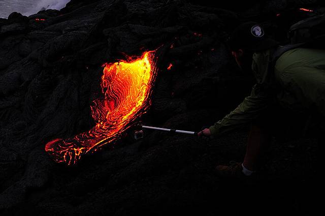 熔岩上好似一组电视台现场录制节目的人员,冒着危险现场播导Lava节目,也是非常刺激啊