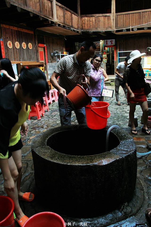 和贵楼的第三奇,即楼中两口水井,暨阴阳井。相距十八米,井水水位均高出地面,左边那口井,清亮如镜,水质甜美,井中几条红鲤鱼翩翩游动,有如精灵,而右边那口井却混浊发黄,污秽不堪,完全不能饮用。(当地传闻常喝阳井里的水,可以生男娃哦^_^)