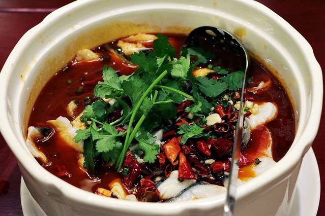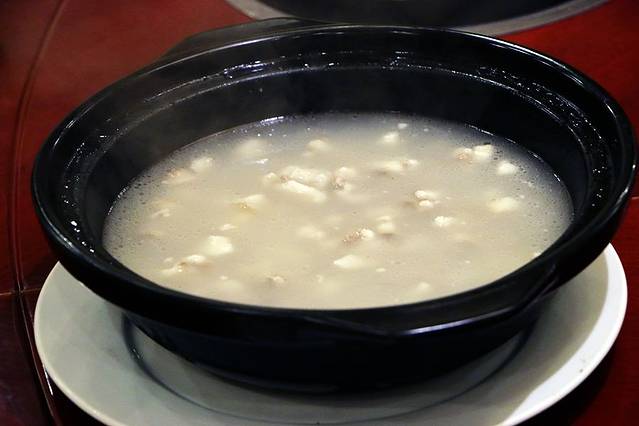再说说“一鱼四吃”,做一鱼四吃的鱼一定要够大,我们吃的这个有4斤多重,我首先看中“鱼肠煎蛋”,因为我喜欢鱼肠做菜,平时自己只会拿鱼肠煮汤,鱼肠煎蛋难度大,已经几年没吃了,果然,这里的“鱼肠煎蛋”煎得金黄金黄的,无腥味,松软可口;“鱼头豆腐汤”,这汤把鱼头、鱼尾煎过,汤呈奶白色,汤味浓厚,味道鲜美;“川味酸菜鱼”是以四川的泡菜做的,菜肉质细嫩,汤酸香鲜美,微辣不腻,鱼片则是嫩黄爽滑。对于喜欢吃辣的我,这个菜很合适我呢;“椒盐骨腩”,炸锅的鱼骨腩粘上椒盐香脆可口,很好的下饭、下酒。