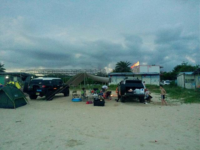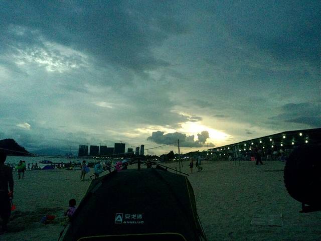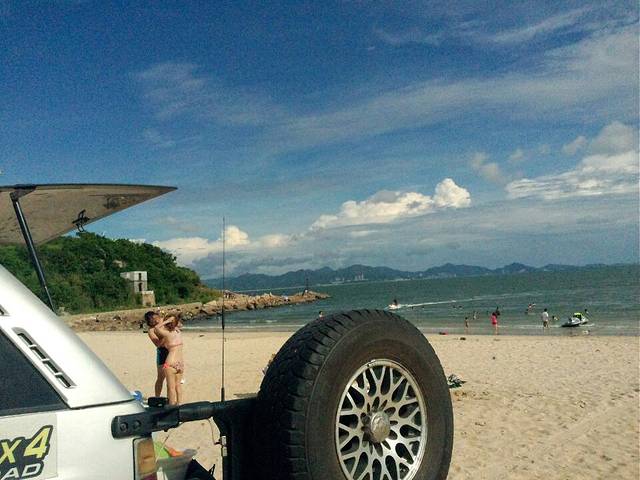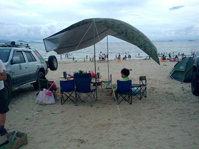 中午13点出发的,去到3点半~开始组装搭建帐篷~当时很大风~费了不少力气才搭建成功的~~熊猫沙滩人不多,很适合度假休闲~~不像深圳东西冲那样人满为患~~我们把车开到沙滩上去做帐篷支架~因为太大风了~~