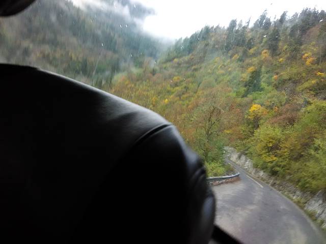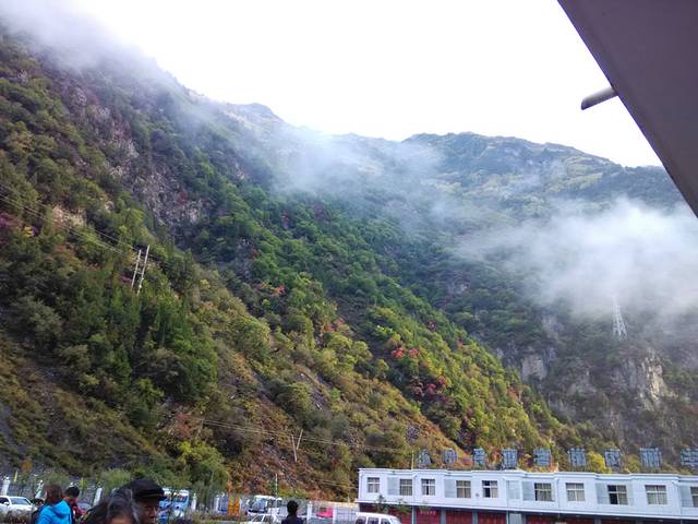 早上7点出门,门口有很多当地人开的小面包车,15元到毕棚沟景区,从理县到景区要开30分钟左右,但两边山上已经的红叶,不是全红,还是红的、黄的、绿的,五颜六色的,已经很有秋天的味道了。在车上,照出来失真了。