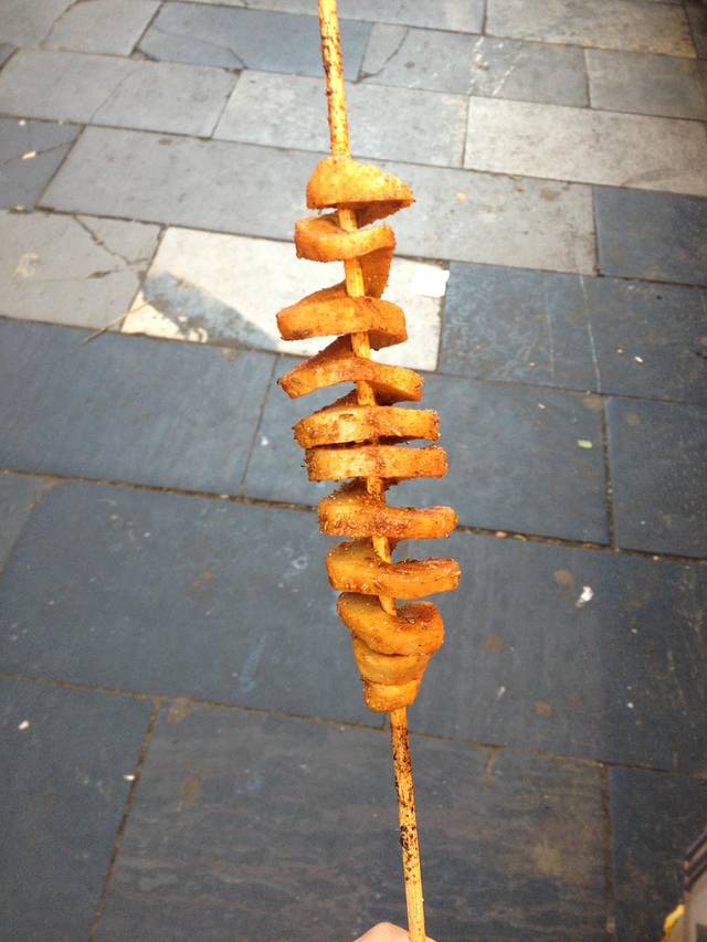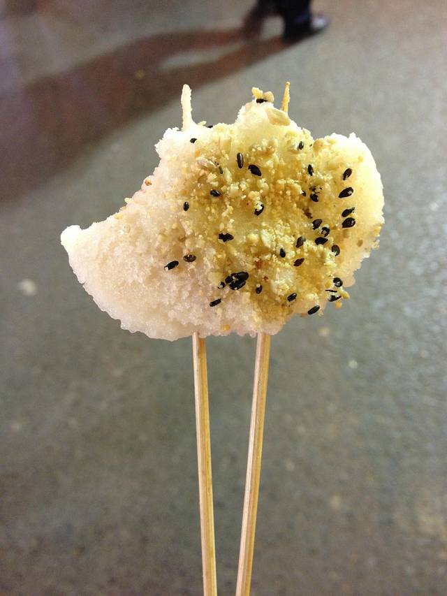 红红炒米家点了一份酸菜炒米15元,有点小辣,老陈醋的酸味很浓。一杯石榴汁10元,很好喝哦。烤鱿鱼一条5元。羊肉串2串,5元一串。还来了一个豆沙柿饼,2元一个,也有卖2.5元一个的。