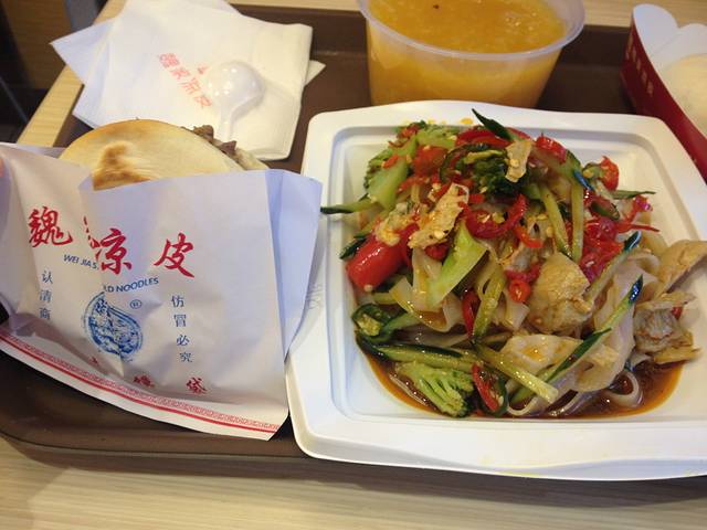 今天是东线游,早上在魏家凉皮吃的早餐,秘制凉皮8元,肉夹馍7元,馍是脆的,很好吃,凉皮很韧,口感很好,就是比较辣。