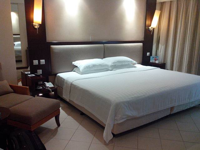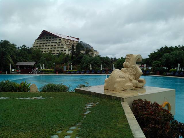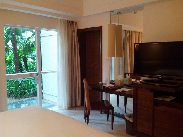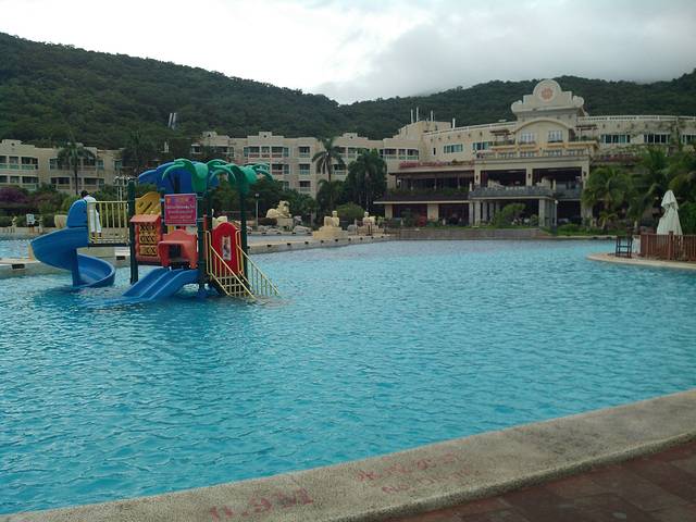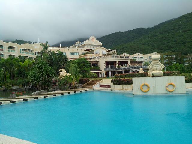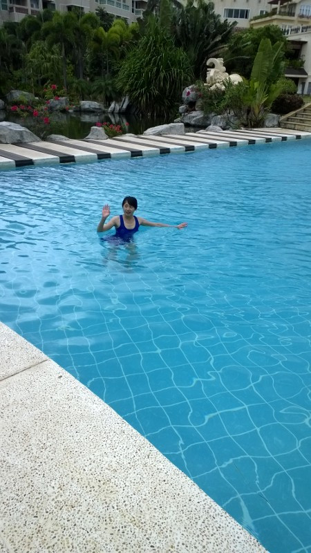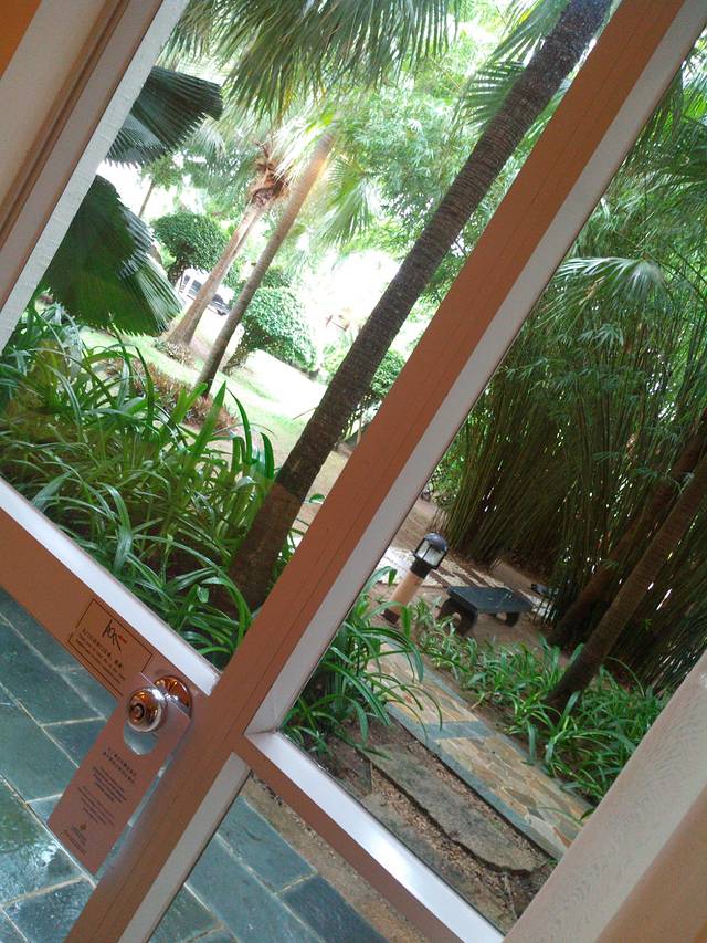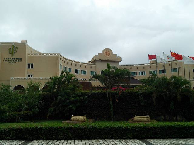 上午睡到自然醒,外面一直在下雨,天天下雨。中午我们坐车向亚龙湾出发,下了公交车走一段路就到了仙人掌度假酒店,酒店免费给升级成两米四的园景大床房。酒店景色令人心旷神怡,很大很漂亮,拥有亚龙湾最大的泳池,三亚正在召开自行车环岛赛,都住在仙人掌。我觉得即使不看海、不出行,只呆在酒店里就是一种享受一种度假。放好行李去百花谷吃饭,正如大家所说,百花谷里最便宜的可能就是必胜客了。饭后去亚龙湾海边转了转,消化一下,准备给晚上的自助餐腾出肚子。自助餐我觉得还不错,起码干净卫生,荤素蔬果搭配得当,188每位,老杨扫描了仙人掌的微信,168每位,在亚龙湾,我觉得仙人掌的还是不错的,一碗兰州都20啊。饭后老杨拗不过我,跟我去游泳,没想到我这只旱鸭子竟然还能有模有样,老杨很佩服我,只可惜太累了,根本游不远,还经常呛水。回房间洗了热水澡就睡觉了。