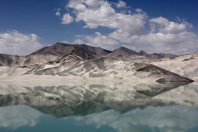 中国名叫白沙山的地方有很多,而此次我们看到的是位于喀什通往红其拉甫公路西侧的的白沙山,当我们在国道上绕过一段山脉,呈现在我们眼前的画面简直无法用语言来形容,感觉特别的不真实,水对岸的奇特景观就是白沙山,远处的深色山脉映衬着近处的白色沙丘,就像一幅中国的卷轴山水画。天蓝、白云、白沙山、明镜的水面。这一刻世界都安静下来,听,仿佛远处传来嗡嗡的鸣沙声。银白色的西沙伸入水中,据说这水是当地的水库,远远地望去看不到尽头,水库的名字叫布伦口水库。