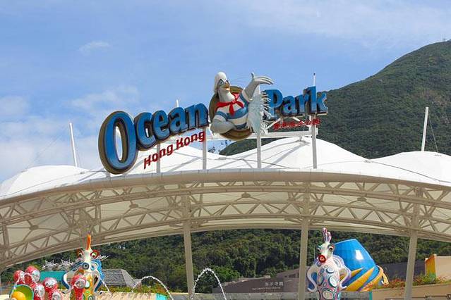 【香港海洋公园】是自在1977年1月10日开幕已经36周年。公园指南上写成公园的宗旨:让您我融入大自然。入园的门口上的海洋公园LOGO是穿着水手衣服的可爱海狮。因为住的离这里不远,早上9点就入园了,门票是提前在旅行社购买的,价格也便宜一点,也可以在淘宝上很多旅行网站上提前购买,免去来到这里排队的时间。成人280元港币,小孩140元港币。