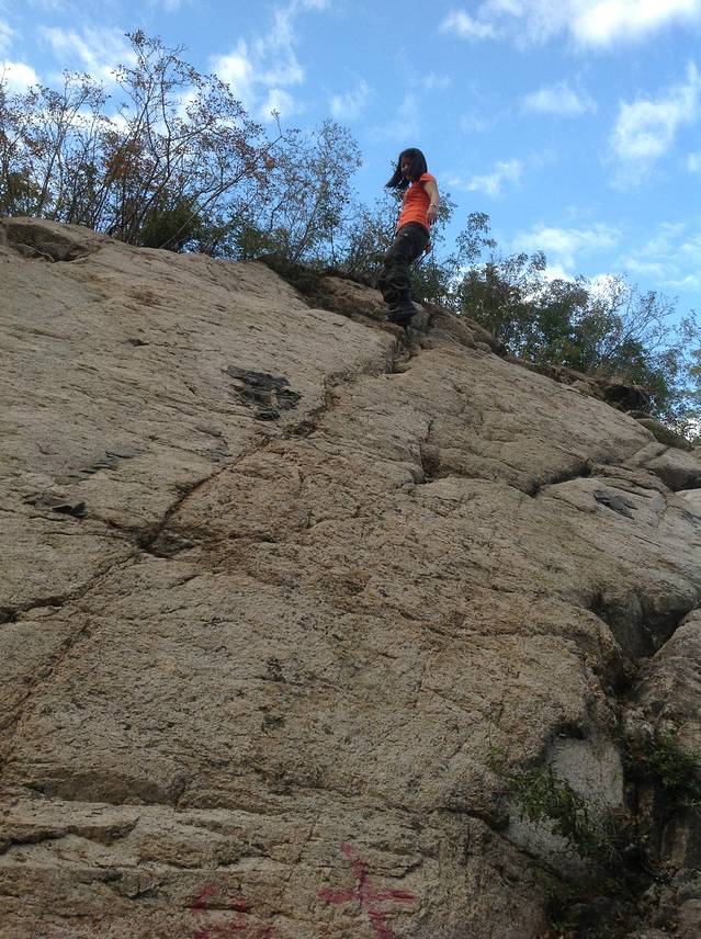 从飞来石塔下山的路上,有一块大石头,可以冲上去,再冲下来,也很好玩