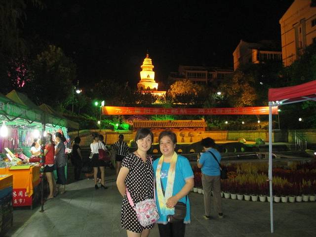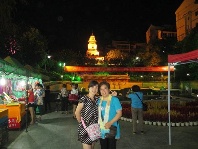 这是杉湖的日月双塔其中之一的日塔,通身金黄色,月塔照片模糊了,通身银白色~夜色中遥相辉映,美极了~
