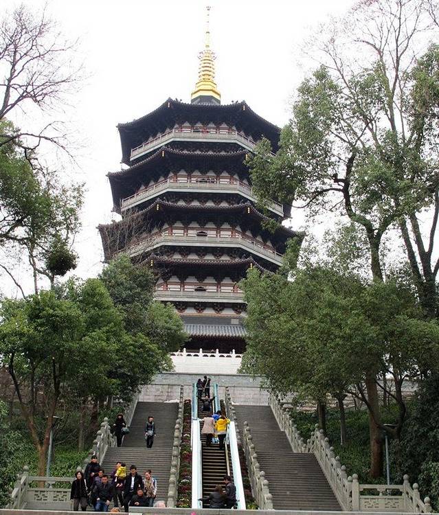 沿途一直漫步到雷锋塔下,《西湖志》这样赞美雷峰夕照一景:“孤塔岿然独存,砖皆赤色,藤萝牵引,苍翠可爱,日光西照,亭台金碧,与山光倒映,如金镜初开,火珠将附。虽赤城枉霞不是过也。”
