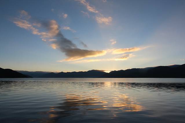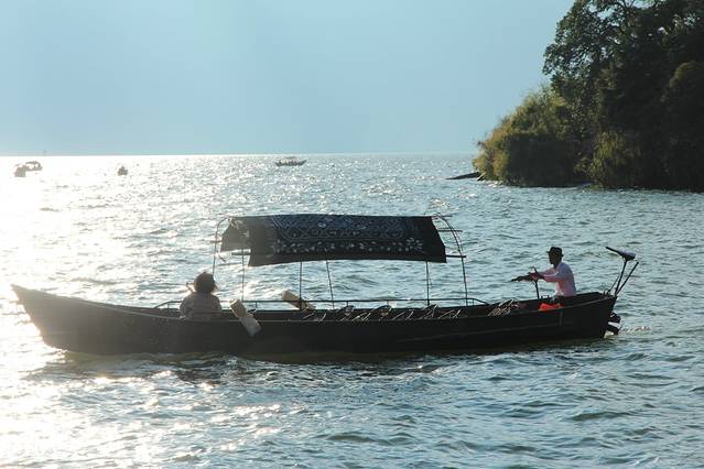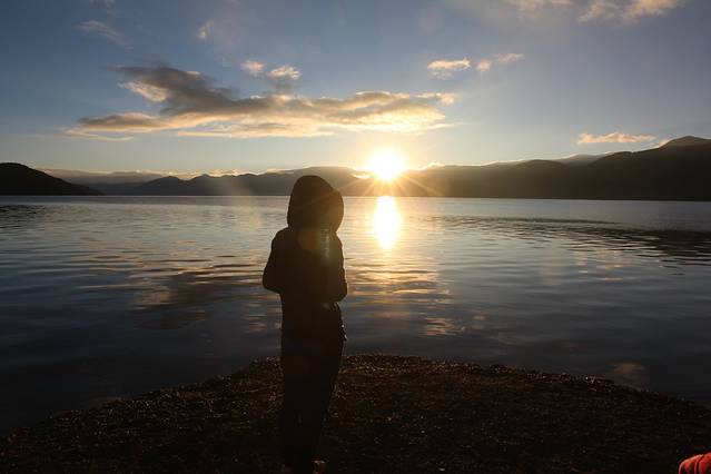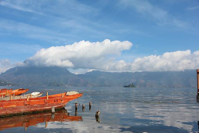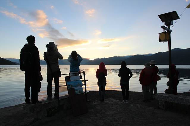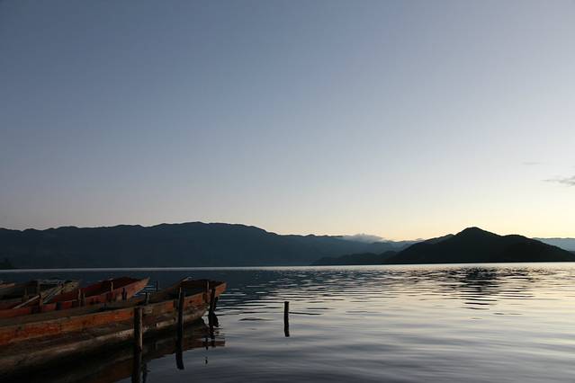 由于昨天没有联系好船家,于是便自己上网搜日出的时间,然后早了半小时出去看看有没有船,结果船是有不少,却没有划船的人...于是便在岸边看的日出,其实也不是很美,不像海平面那种日出,可能因为这边海拔高而且有山,太阳一出来就很亮了,有点小失望啊