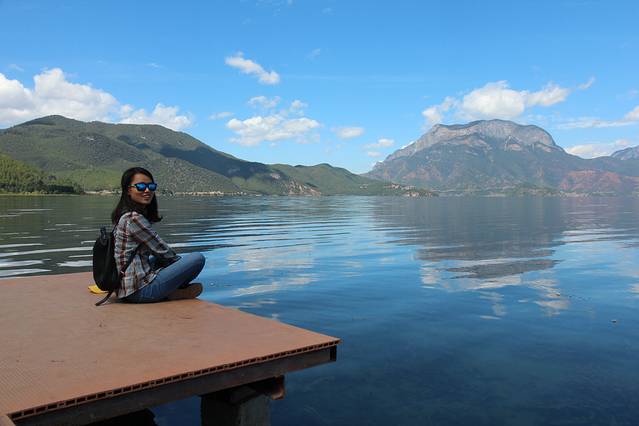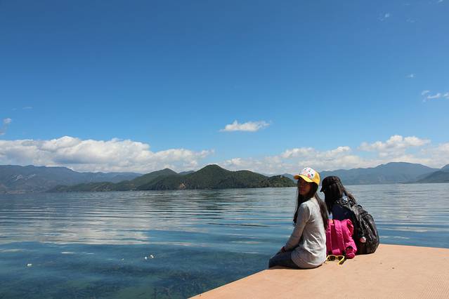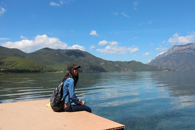 因为客栈就可以直接报团,而且在客栈听了刚刚从泸沽湖回来的情侣的建议,我们就直接在客栈报的团,如果全程跟团的话都是两天团,由于去泸沽湖要7个小时车程,我们觉得两天有点赶,于是就只跟车去,不跟团,跟车好像有160每人和180每人来回,分别就是坐的车不一样,我们选择了180的,因为走的都是山路,而且一直绕一直绕,推荐大家还是做好一点的车,不然晕车就完蛋了...差不多一个小时会停车休息一下,我们在第一个点看到后面的车有人下来吐..第二个点又看到她下来吐...第三个..第四个....真惨啊...我们同车的人是淘宝买的车票,好像比我们便宜一点,所以大家也可以淘宝看看.去完泸沽湖之后我们还会回丽江,所以就将大件的行李寄存在客栈,背着个书包就启程了.我们是早上6点的车...天都还没亮就出发了..