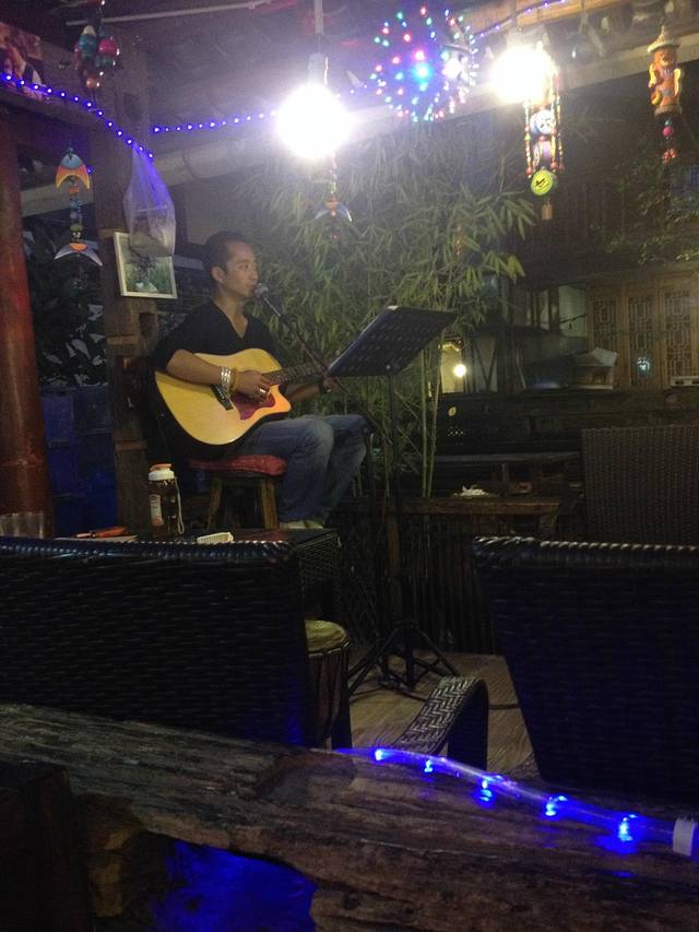 晚上回到丽江已经5、6点了,随便找了间饭店吃饭,这人唱歌挺好听的
