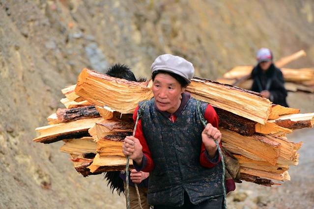 (在前往村寨的山路上,偶遇背着柴火归来的村民)