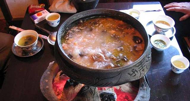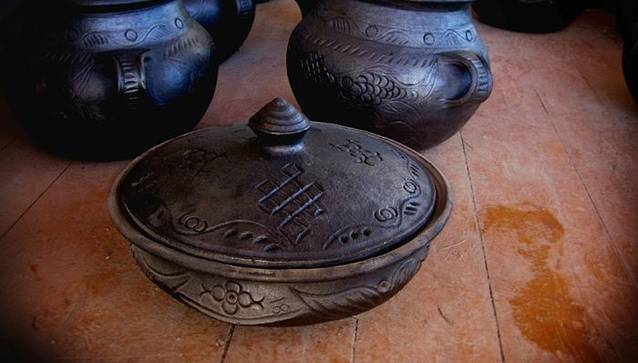 黑陶是尼西藏族人生活中不可或缺的物件。常见的黑陶制品有酥油茶罐、炭火盆、藏八宝、鸽子壶等,而最广为人知的则是形状扁圆的黑陶锅,这跟尼西当地非常有名的一道菜有关,那就是“土锅炖鸡”。尼西的土鸡身材袖珍、味道鲜美,而炖鸡所用的锅,必须是黑陶。黑陶炖土鸡,色相味俱全,令人垂涎欲滴。