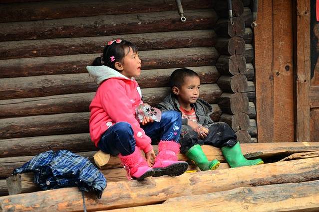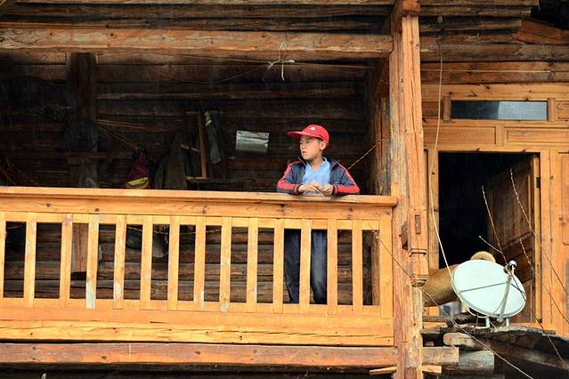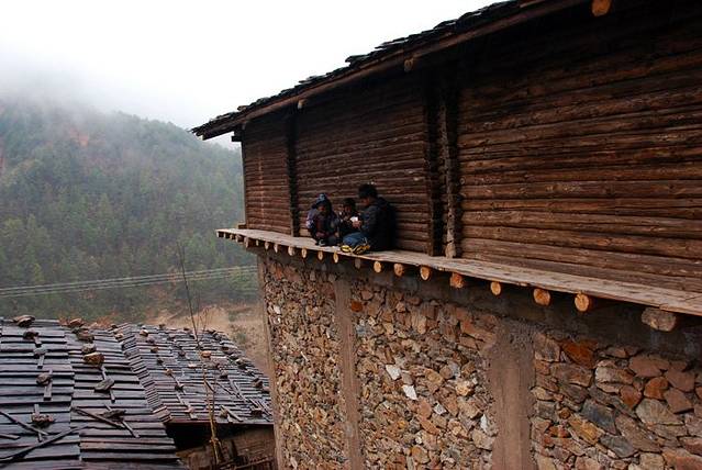 (城里来的孩子,正好奇地看着窗外这原始的村寨)