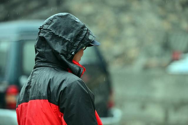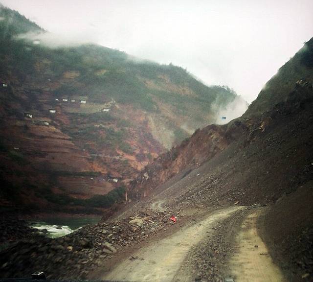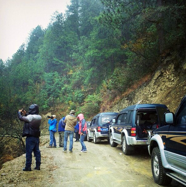 (远远地看到对面雨雾中的村寨,车队停下来拍照)