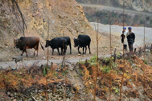 (我们的车队盘山而上,遇到放牛归来的村民。牛悠闲,人更悠闲)