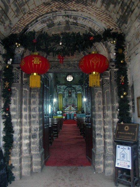 仰头可以看到高高的教堂主体墙,进入教堂前竟然要先通过一个中式建筑风格的大门,而这个大门上竟然挂着大红灯笼、帖着春联。