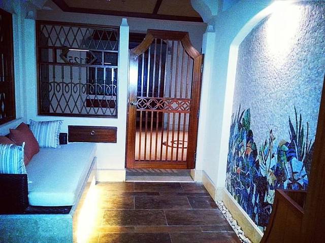 折回酒店大堂,叫景观车送我们去南池,是酒店公共泳池,还有一个温泉池。离住的楼非常近,走3分钟原来就可以到了。