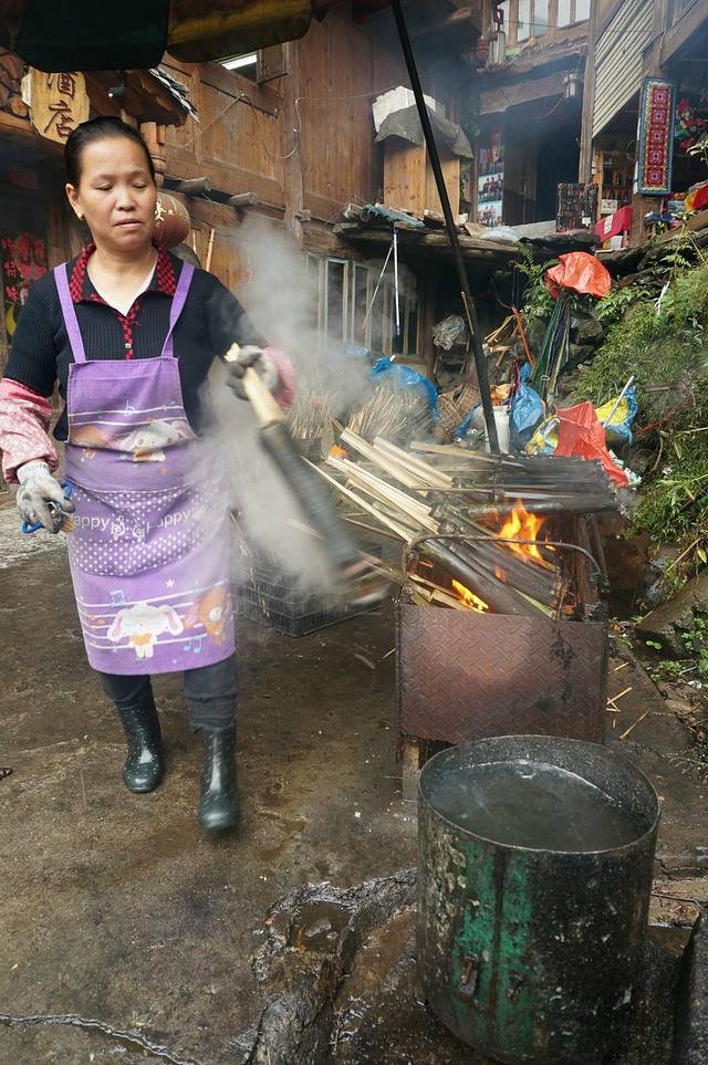 6点不到就醒了,外面淅淅沥沥,撩开窗帘,我去!下雨了!说好的日出呢!回去继续睡吧!再醒来8点了,一看外面,我勒个去!起雾了!哭都没眼泪。我到底是来干嘛的!可是我总不能睡过去吧。起身在寨子里转了转,买了几张明信片,又吃了一份竹筒饭。竹筒都是一次性的,烧了一次只能扔掉。饭里和了腊肠和芋头,米是糯米,特别香。吃完后还是决定去七星抱月观景台去看看。