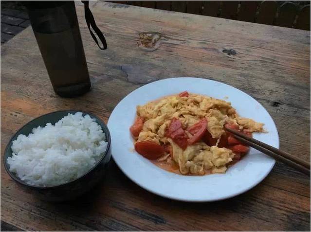 番茄鸡蛋,番茄特别少,鸡蛋特别多,油也特别多,很淡,像是忘了放盐。但是米很好吃,很香,软软的但又不是水加多了糊汤的那种粘。没吃饱也没吃好,但总算是吃了一顿饭。