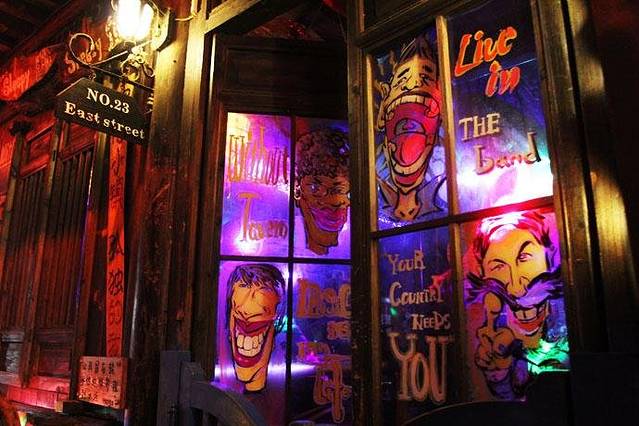 ▲桥的对面就是景区的的检票处和酒吧一条街。位置不用说非常方便,临河的街景很不错。我们安顿好之后,随便吃点东西就开始夜游古镇。到处是飘扬的歌声,准确的说酒吧传来的音乐风格我都不是很喜欢。我更喜欢放着悠扬的蓝调音乐。