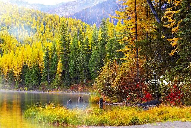 从9月中旬,漆树、黄杨、山毛榉等率先以深红、鹅黄拉开了秋的序幕;随后,糖枫、红枫、西克莫枫等上百种枫树也慢慢由黄色、橙色转变成红色,与交织其中的绿松、杉树共同谱写出秋的主旋律;而伴随着越来越长的夜晚、越来越凉爽的天气,北方红枫等加东常见的树木,以深沉的红褐色预告着秋天即将谢幕。当这些如马赛克般红的、黄的、橘红的、褐色、金黄的色彩掩映在碧水蓝天之间,你会惊叹于造物主的巧夺天工。