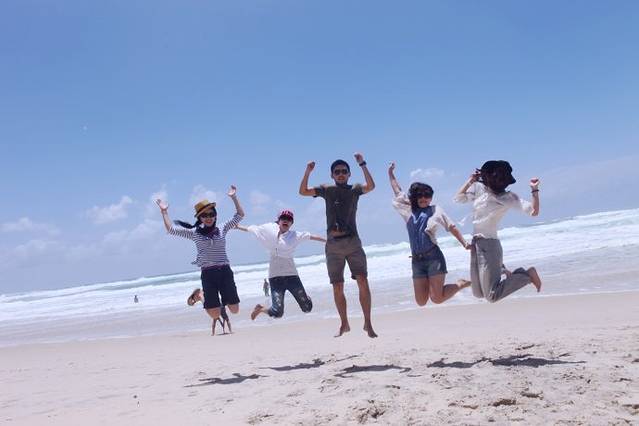真的走了,才知道行走的意义,不是为了浏览他人,只是为了发现自己。真的遇到了阳光、海滩、蓝天、白云,才真正知道它们如此存在的意义,让我们面对便心存微笑,让我们一眼却深深迷恋。钱钟书老先生说:旅行最试验得出一个人的品性。旅行是最劳顿,最麻烦,叫人本相毕现的时候。经过长期苦旅行而彼此不讨厌的人,才可以结交作朋友。回味这一程旅行,之所以这般快乐难忘,在我体会最主要的原因便是我们这群志同道合、臭味相投的临时组合太过默契完美,既然说到这,不如先介绍一下我们此次旅行的成员和各自来源,此次成员5个,也是租车租房合并意见的最佳人数,其中我和图图妈大家都认识,闺蜜党,从北京出发;新加坡的朋友“冬哥”其实是比我小两届的校友,因为是我老公的老乡而认识,并且他跟图图妈是同届同系的校友,毕业后他一直在国外求学、工作,跟他从新加坡出发的还有他的女朋友泡泡;在布里斯班等我们的还有一个可爱的小妹妹Nic,她在澳洲读研,跟“冬哥”很神奇的在一次欧洲自驾游中认识,很善于做旅行计划,虽然第一次见到Nic,但来自于天枰座的相惜让彼此觉得很投缘,没有半点陌生感,虽然年龄差距有点大,但长期在海外求学的独立让她为人处事很是周全。由于5个人都是爱吃、爱玩、爱冒险、刺激的主儿,所以旅行来得都是充满默契的惊喜和快乐。介绍完了先来张合影吧。照片从左至右依次是:图图妈、泡泡、冬哥、Nic、吃饱饱。