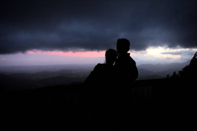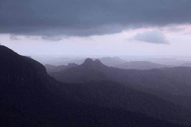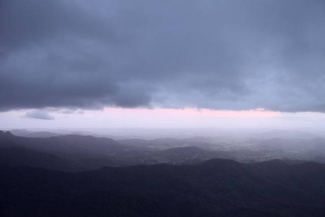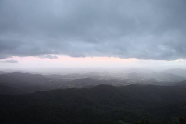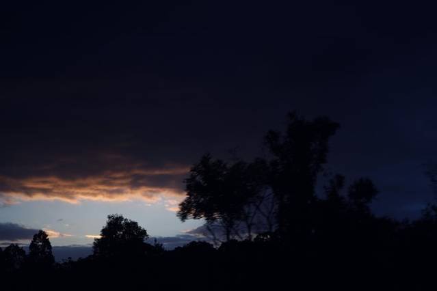 因为GPS上只能输入道路名,之前从网络上搜到一个春溪国家公园的小地图,输入了Springbrook Road,GPS上显示距离并不是很远,约40公里,我们预计开车40分钟左右就可以到达,所以大家并不是很着急,在超市买了晚上要吃的东西才悠然出发,但一切有些出乎我们的意料,这个在平地上开车40分钟的路段,有很大一部分是道路狭窄的弯曲山路,因为地形不熟,开车又很小心翼翼,以至于开到最后我们几乎是追着夕阳赶路,说是国家公园,但其实就是一个很是原始的森林公园,路标不是很清楚,只有对面零星交错的车提示我们没有迷路,路边偶尔有独栋的房子证明这里有人出没,还有在路边偶尔跳跃的袋鼠陪伴,据说在澳洲路标如果车撞到了袋鼠,是可以带回家吃的,因为澳洲的袋鼠比较泛滥,并不进行保护,不过话虽这么说,谁会忍心吃掉这么可爱的动物。言归正传,其实到了国家公园,一路有好几个look out,但我们到达那个best,最好的瞭望台,看到最棒的日落,不甘心的继续前行,最后我们终于找到了,从我们停车点到那个瞭望台的最后350米的木栈道,我们5个人几乎是以各自百米的速度跑过去的,回程这350米我们才发现,当时黑漆的木栈道其实就是森林里的一条小路,我们每个人独自跑在里面其实还是蛮危险的,但当时大家的勇敢是抛家舍业的,就是为了抓住那夕阳的尾巴,但结果是我们还是晚到了十分钟,微微泛红的晚霞已经躲进了黑色的乌云里面,美美的给了我们一个充满遗憾的回眸。