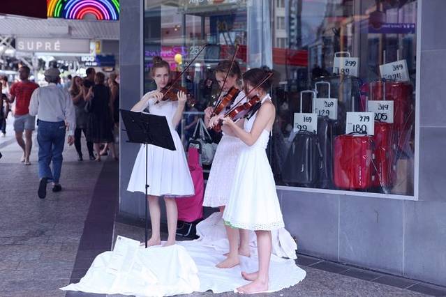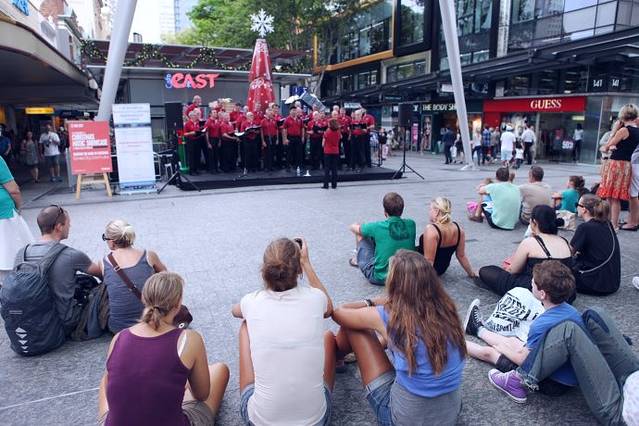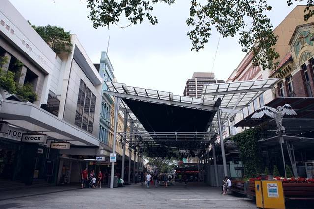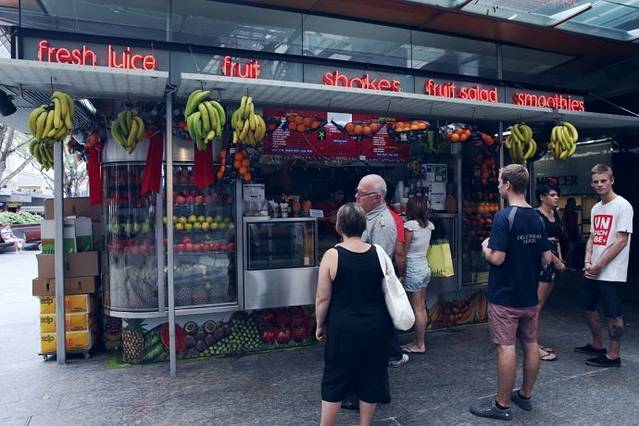 布里斯班的商业街就在酒店走过去两条街道的Queen St.,因为check in的时间是下午两点,所以我们把行李寄存在酒店前台便去CBD闲逛一下。澳大利亚盛产丰富的水果,渴了累了,我们买杯鲜榨果汁路边享用。5.5AUD/杯