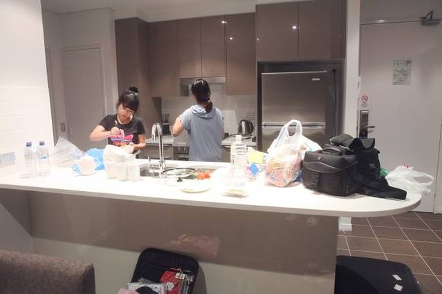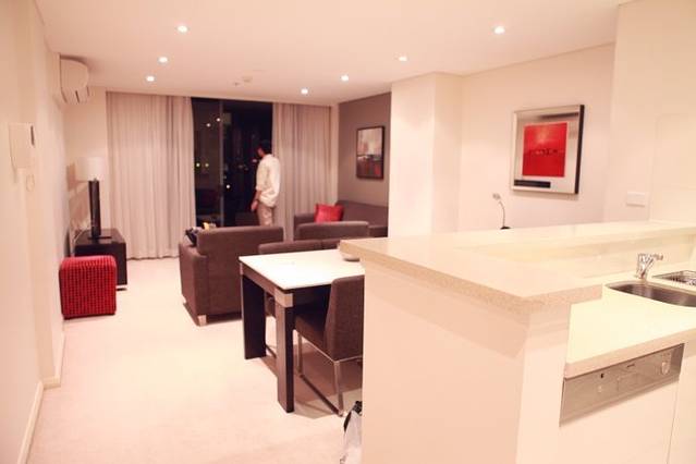 天色暗下来了,我们告别猎人谷,开往了我们在悉尼的住处位于悉尼西部Parramatta区Gorge st.的Meriton,我们要在这里住三个晚上,据说悉尼的Parramatta是悉尼比较乱的地方,所以房费比黄静海岸的还要便宜,三晚上一共才不到900澳元,关键是我们这次住的Meriton是一套140平米的复式公寓,大家楼上楼下的窜,似乎在家都没有过此种待遇,前台的帅哥很nice,温和谦逊,我们有一种到家的温暖感