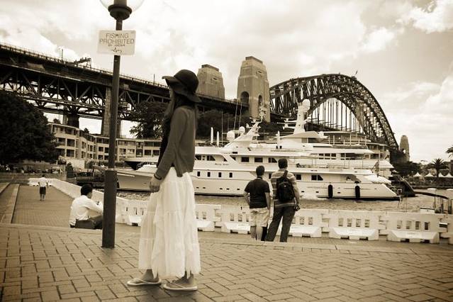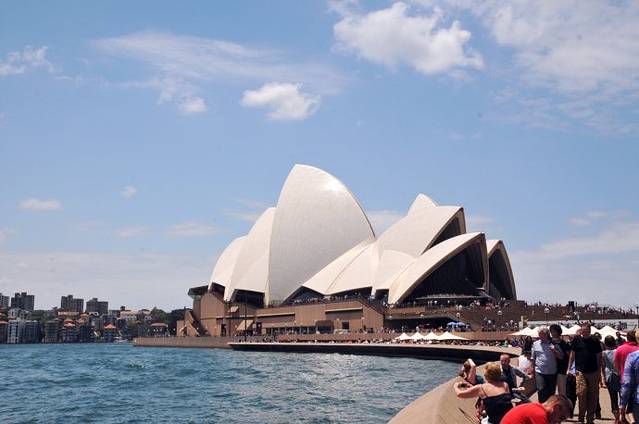 在很多之前没到过澳洲的人(包括我自己)来讲,一提到澳大利亚,第一个从脑子里冒出来的名词一定是“悉尼歌剧院”,但是经过这一路经历过来,发现那真的仅仅只是一个标志而已,也可以说是个代号罢了,就像一个人的名字,第一耳的感觉一定与深了解后有着或多或少的差别,本来是打算在第一眼看到歌剧院时狠狠的张大嘴巴惊讶的,用我的机器拍拍我眼里的她,也许是看过太多的照片,听过太多的讲解,看到它的真面目时完全没有之前想象的激动,甚至可以说是出奇的冷静,因为它真的不如宣传片中拍得完美,鹅黄色的外贴面瓷砖已经泛旧,慕名而来的游人堵塞了我们的心情,完全没有走近她的冲动。其实按道理我这个学习建筑结构的工程师应该走近她,研究她,但我却因为她的不够完美止步了,最后我们只是把她作为背景的创作了一番,记住这个时刻,留住这个画面,其实还是蛮美好的。