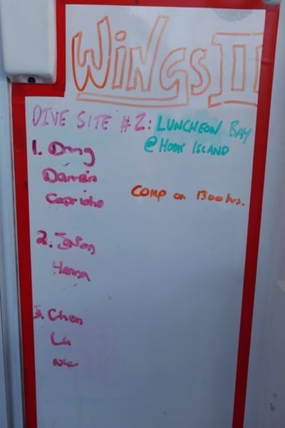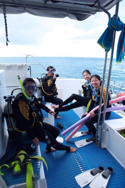 从9点出发,经过两个小时的海上颠簸,我们到达第一个港口blue pearl bay(蓝珍珠港),在这里我们要进行第一次的深潜。不是所有人都要深潜,我们是之前网上就已经是按照套票预定的,每人340澳元包括两次深潜,其他不深潜的游客可以在附近浮潜,这个是免费的。从告示板的提示中知道,我们四个女人是被分在第二组的,在等待第一组成员的时间里,我们在船上创作一番。