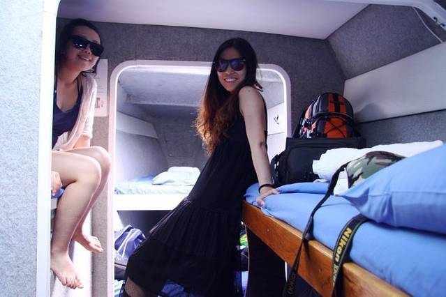 游艇不是很大,却能供23名游客外加3名船员吃喝拉撒,我们很好奇的首先参观了休息的地方,每一个空间都被利用的很恰当,休息区分别位于船舱的两侧,每侧设有一个卫生间,可以上厕所和洗澡,水很充足,并且各种设施非常干净整齐。我就睡在此时所在床铺的下铺。