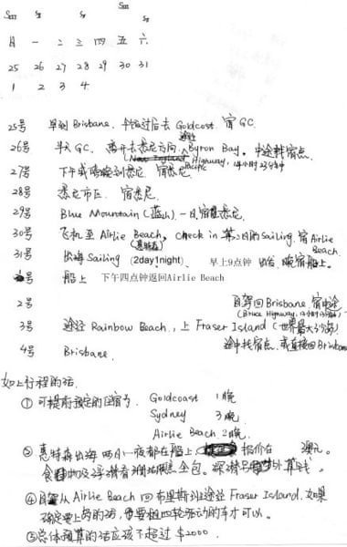 先附上跟我同名同星座的澳洲小妹妹发过来可爱又细致的手写行程,我和图图妈23号从北京飞布里斯班,与从新加坡飞至布里斯班的朋友汇合,在当地还有一个澳洲mm,一行一共5个人,租一辆车,沿澳洲东海岸行驶1千多公里。