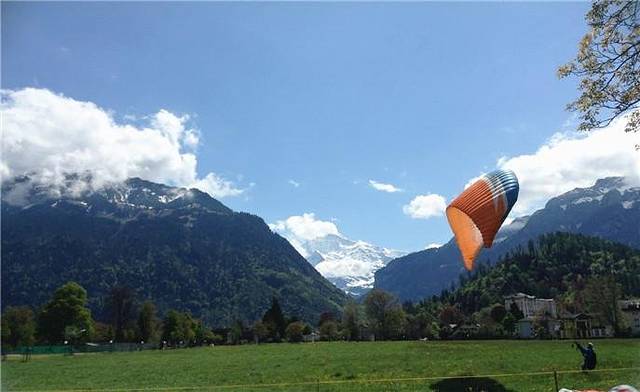 因特拉肯是滑翔伞的圣地,世界各地的人慕名前来跳伞,以另一种视野欣赏这里的美景。游客在因特拉肯跳伞。