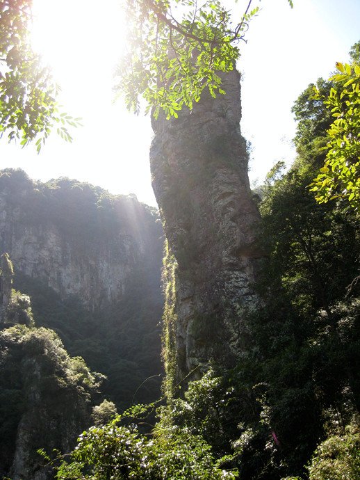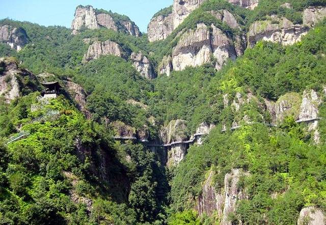 我们沿悬空栈道走到了山顶凉亭。站在凉亭上,三面是万丈深渊,山峦叠嶂,居高临下,峡谷一目了然。