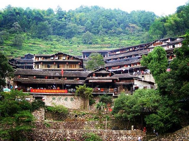 林坑的古村落建筑,都是普通的富有层次的山地民居,由低而高顺山势而建,随山势起伏,无序中尽显自然,变化中可见统一。