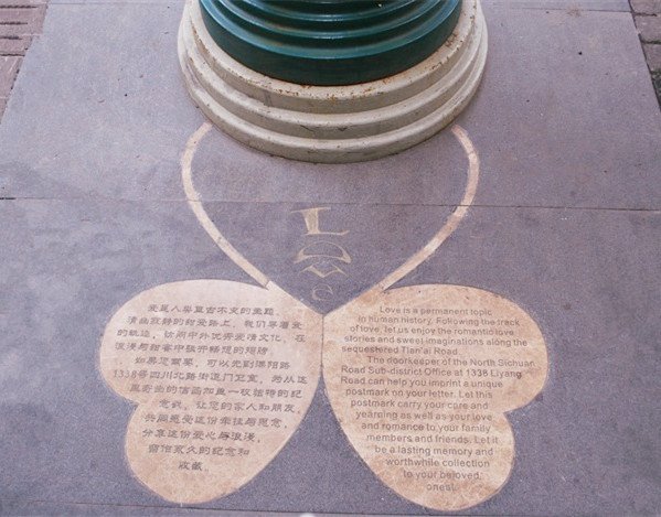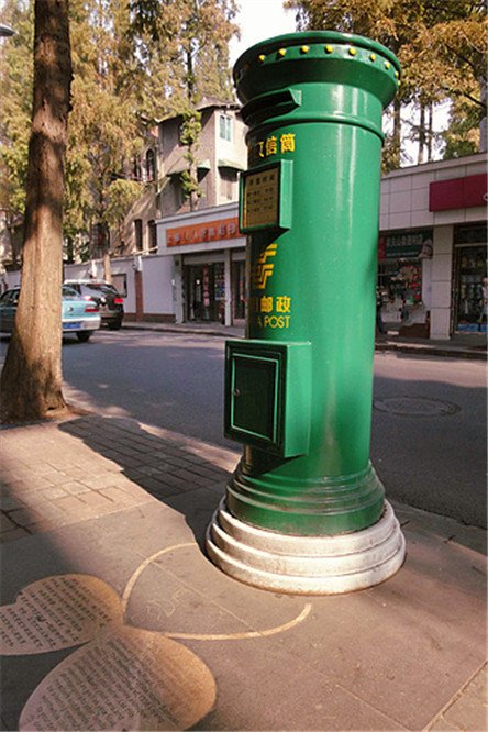 甜爱路上有一个非常有人气的爱心邮筒,从这座爱心邮筒投出的每一封信函,都将被盖上一枚英文爱的邮戳。