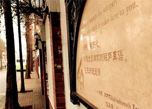 甜爱路的一侧,是一排长长的矮墙,墙上镶着28幅古今中外著名诗人的爱情诗歌。其中有莎士比亚、泰戈尔、柏拉图、裴多芬、白居易、王维、徐志摩、戴望舒等。人们也把这道墙称为爱情墙。