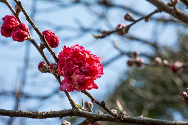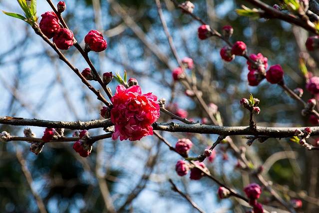 佛缘,小小的门扉并没有打开,只有三两枝树花在争春夺美。