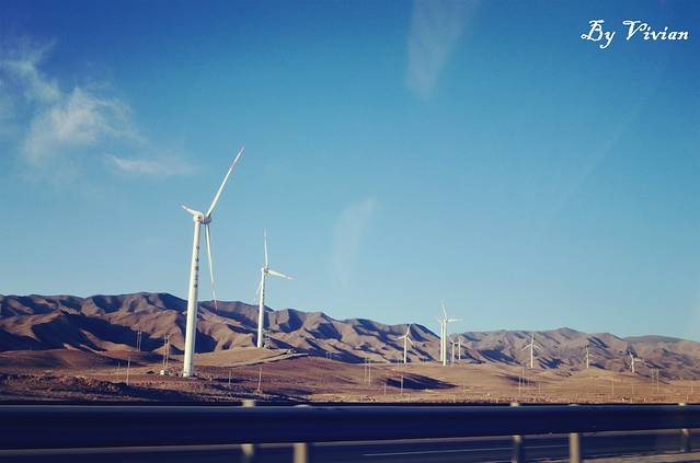 去时的公路两旁,随处可见教科书中所说的风力发电机。
