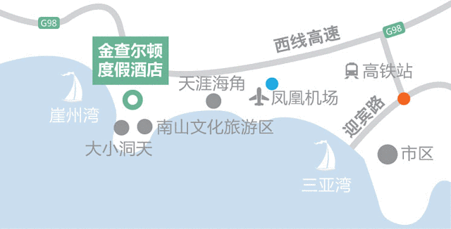 三亚金查尔顿度假酒店与南山旅游风景区及大小洞天风景区同属崖州区,三亚其它湾区到这两个景点的车程在20-60分钟左右,如果是带孩子或老人出行,经过长时间的舟车劳顿到达景区后,孩子和老人可能已经很疲劳,游玩的兴致也会大大降低。如果您的三亚旅游计划包含这两个景点,选择住宿金查尔顿度假酒店是非常明智的选择,酒店到这两个景点仅5分钟车程,每天还提供往返这两个景区的免费巴士,非常便捷,在节省了旅游费用的同时还大大提高了出游的乐趣。
