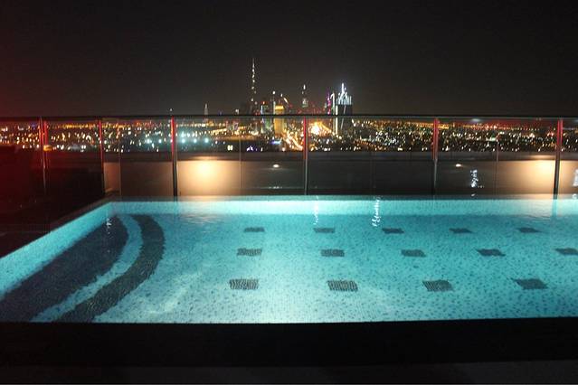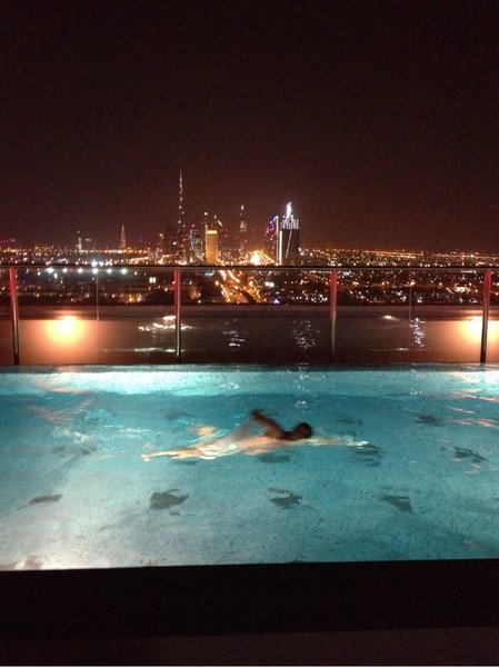 第三天继续购物,顺便去我们酒店顶楼观察了地形,发现一个很赞的楼顶泳池,我估摸着中午的时候可以游游泳(2月份)可以看到整个迪拜的市中心和高楼。