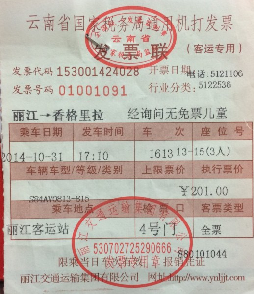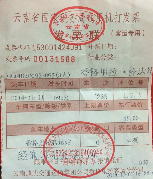 去普达措的车票是在车站买的,回来的车票可以直接在司机手上买。都是15元/人。车站门口有很多吆喝着让包车的,安全起见,还是不要坐的好。第一:价钱贵;第二:不安全。