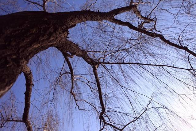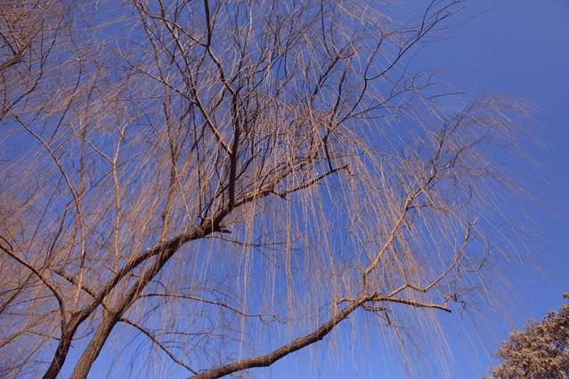 干枯的垂柳,没了葱绿的叶子,但却也欣赏到了丝丝细发随风飘的难得景象。