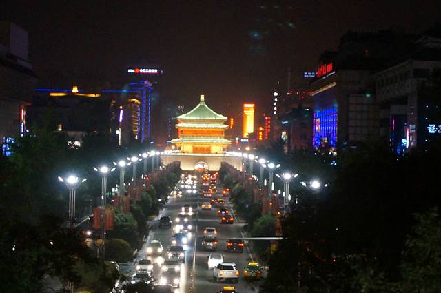 住在钟楼附近最大的好处就是交通便利,离坐机场大巴的地方走路十五分钟,走到回民街只要十分钟,晚上在回民街逛到再晚都没问题。通往回民街的路上看到城墙,屋檐上都是大雁在不断地回旋。
