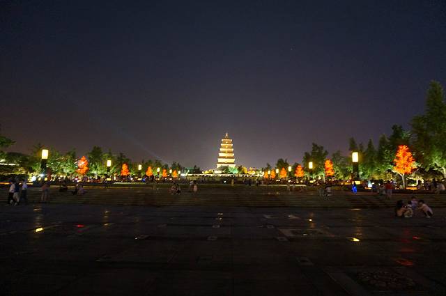 晚上我们来到了大唐不夜城,本想过来看那最有名的音乐喷泉,谁知道我们来的这天开始检修,一直到我们要走都没有对外开放,简直欲哭无泪啊!大唐不夜城与大雁塔遥遥相望,喷泉有开的时候可以看到喷泉后面就是闪亮的大雁塔。